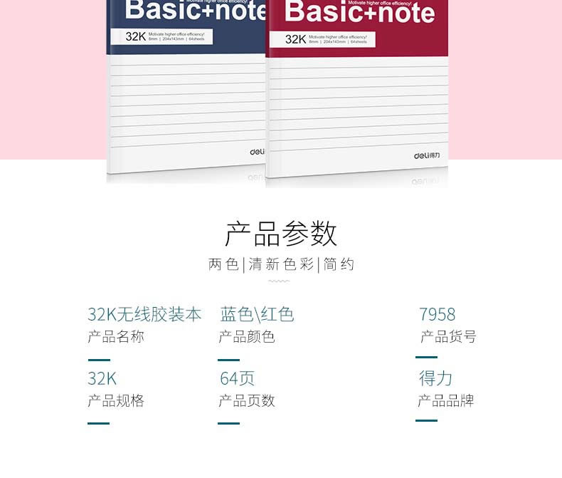 | 产品名称 | 得力7958 32K/64张办公胶装本 无线装订本软抄本笔记本记事本 10本装 | 货号 | ECS001008 |