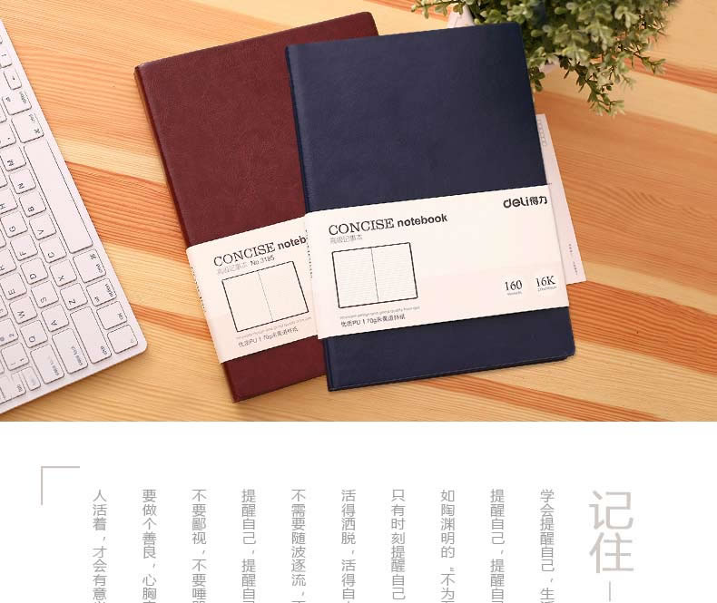 备注:deli得力3185、 16K/160张皮面笔记本 皮面本、会议记事本。
