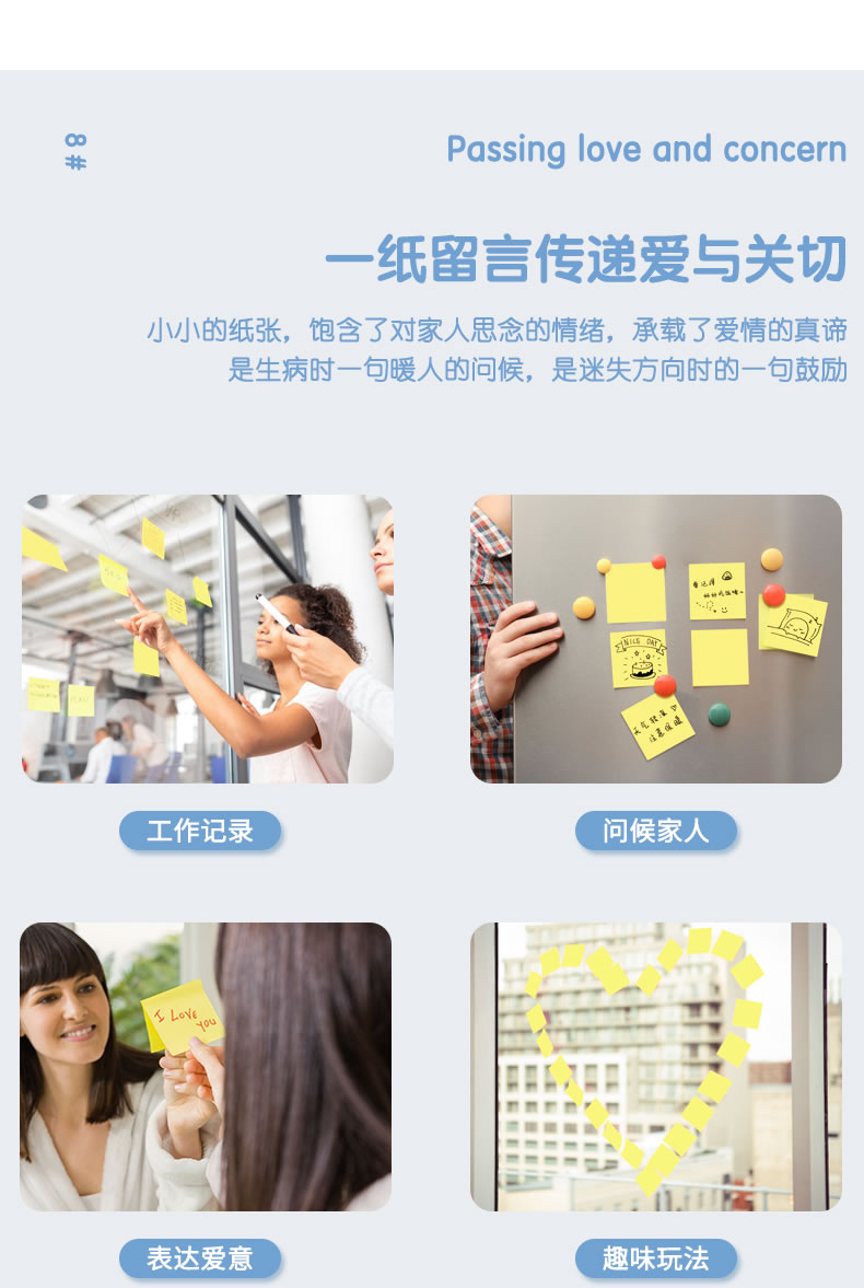 1、可重复黏贴的自粘式便签纸,纸质品请远离潮湿及火源。