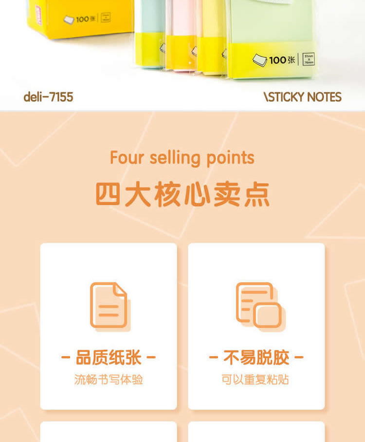 备注:deli得力7155 、76*51mm彩色不干胶荧光记事贴、百事贴、便利贴、标签纸、便签纸、N次贴、告示贴。