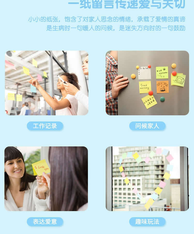 1、每色100张,可重复黏贴,不伤纸,不留胶。