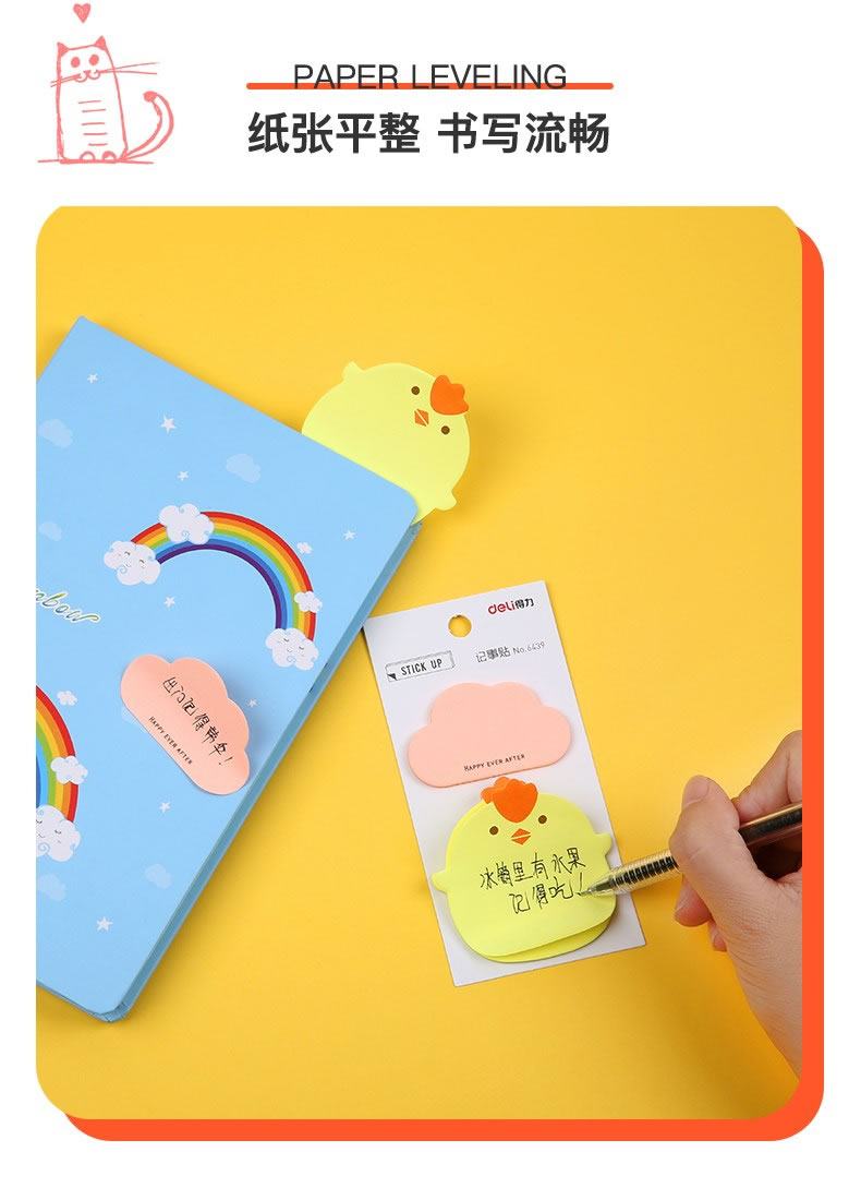 2、童趣讨喜,精美小巧,带给你办公生活好心情,纸张平整柔韧,书写流畅。双图案加倍书写空间。
