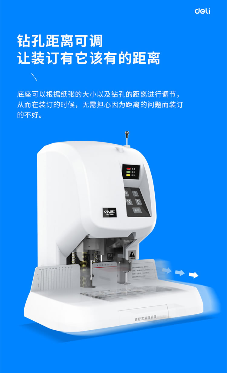 备注:deli得力3880 、Φ6.0*50mm自动财务凭证热熔铆管装订机 、激光定位档案打孔机 、可调边距。
