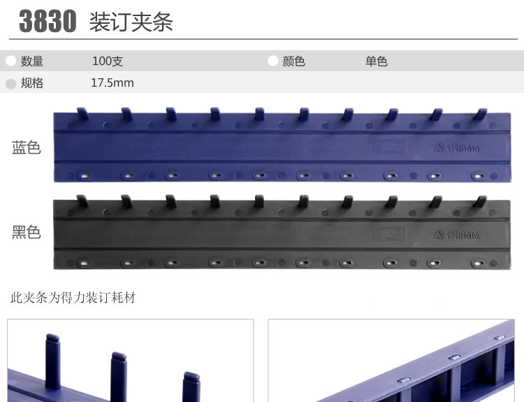 2、夹条为装钉机专用产品,适用于各个品牌梳式装机,与得力装订机产品配套使用可获得好的装订效果。