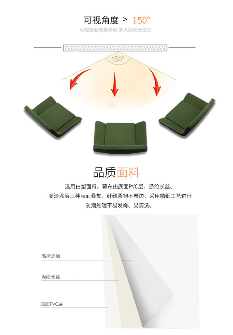 3、白塑幕布微粒光学涂层,减少反光影响,150°视角更广。