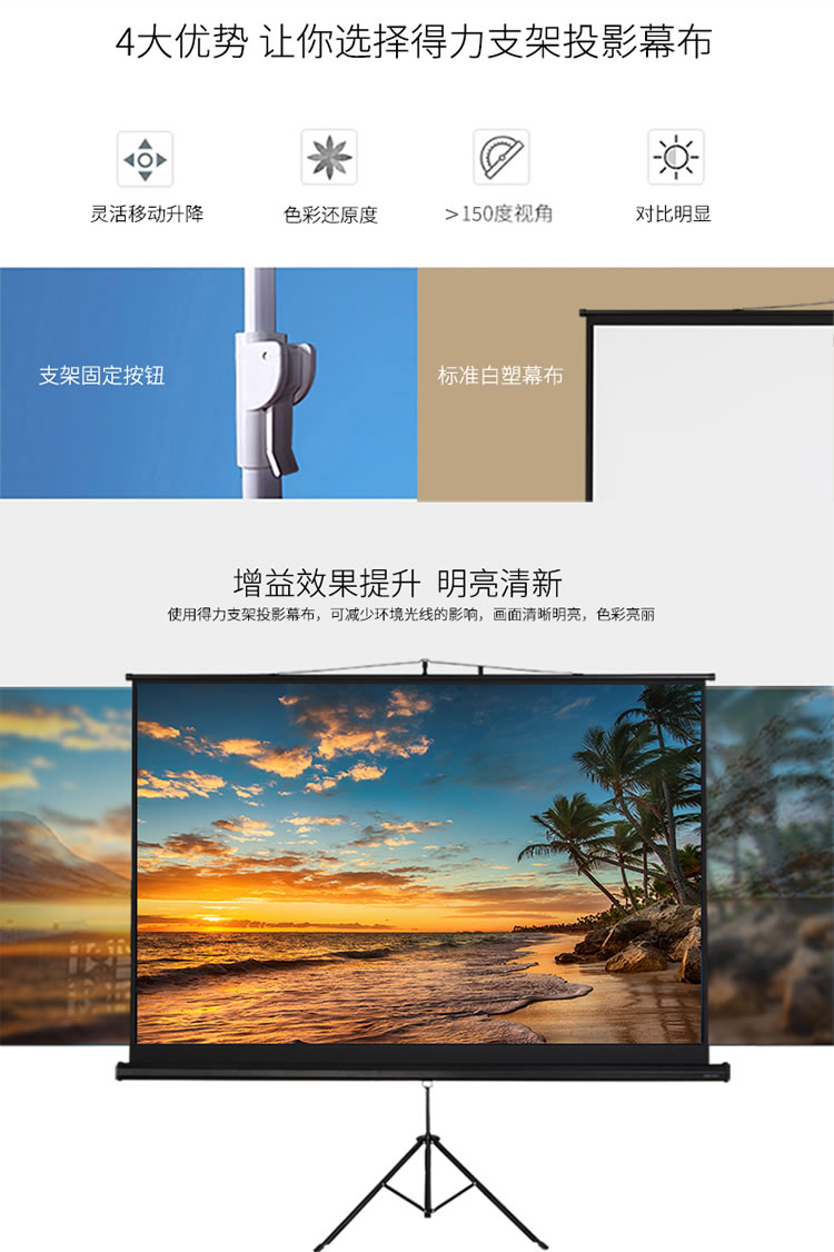 > deli得力50495 100英寸16:10支架投影幕布 投影仪幕布温馨提示:4:3适合办公、教室、商业培训会议投影;16:10适合家庭影院,看电视追剧等!