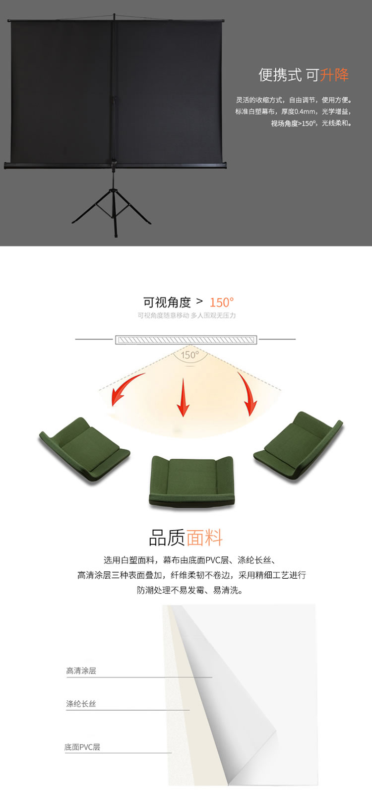3、白塑幕布微粒光学涂层,减少反光影响,150°视角更广。
