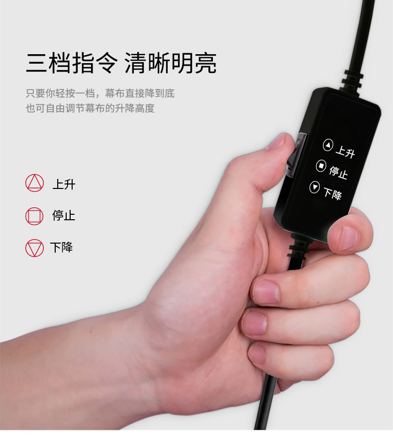 2、三档指令,只要你轻按一挡直接降到底,也可以自由调节幕布的升降高度。