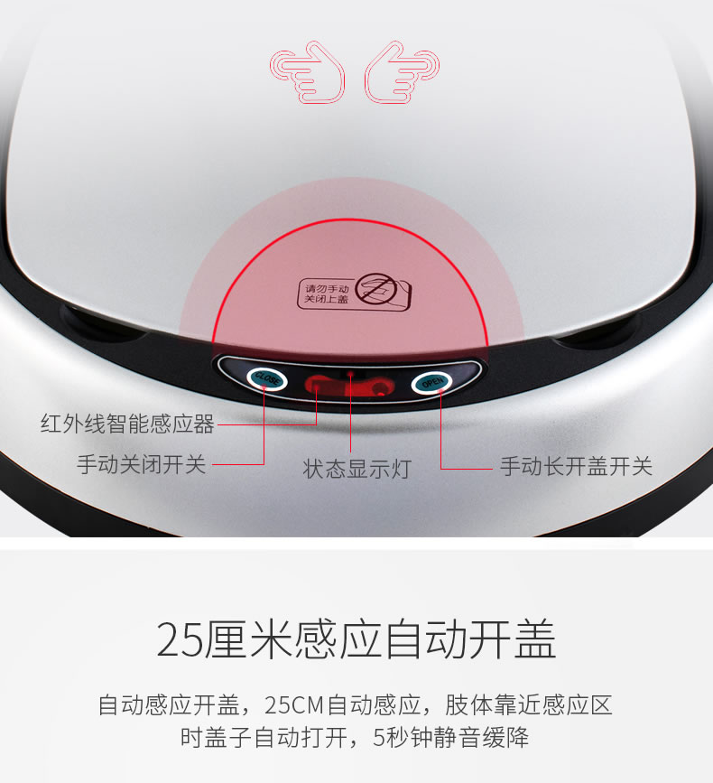3、红外线智能感应,无需接触开盖。隔离手部与细菌的接触自动关闭,防止异味的散发。