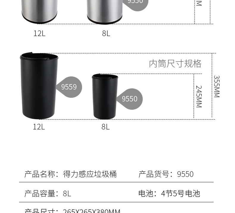 | 产品名称 | deli得力9550 8L不锈钢免脚踏自动感应垃圾桶 加厚静音圆纸篓 | 货号 | ECS001818 |