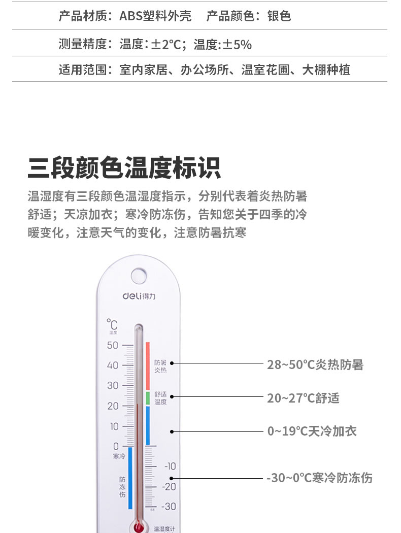 1、为温湿度计有三段颜色,只是分别代表了炎热防暑、舒适温度、防冻伤等区域。