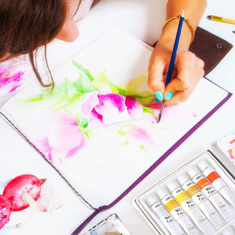 1、得力水彩画是由水调和透明颜料的一种做法方法简称水彩画。