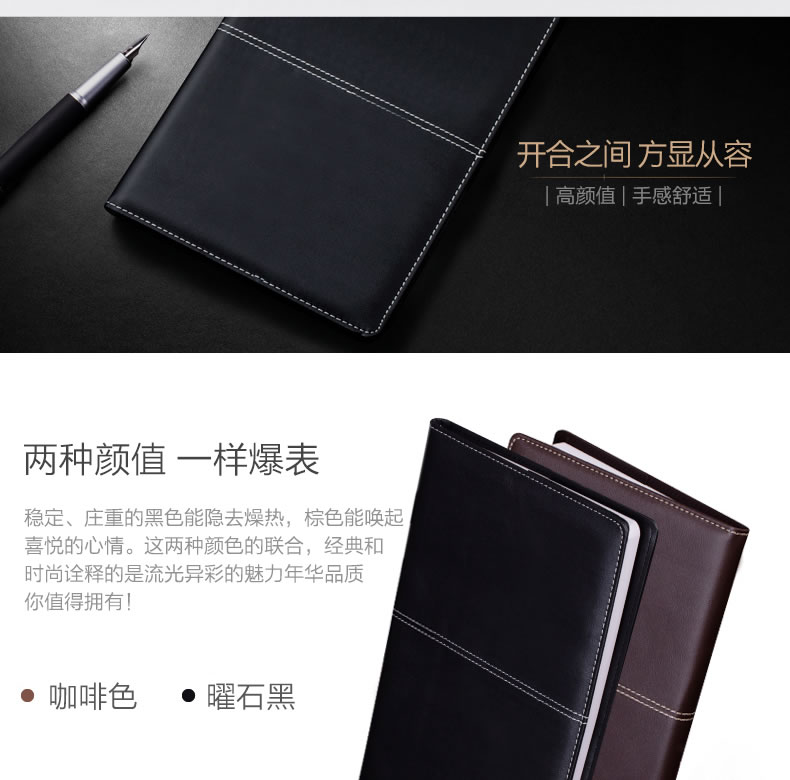 1、皮面笔记本采用荔枝纹皮面,手感舒适,112张书写纸,书写流畅,不晕染量多厚实大气。