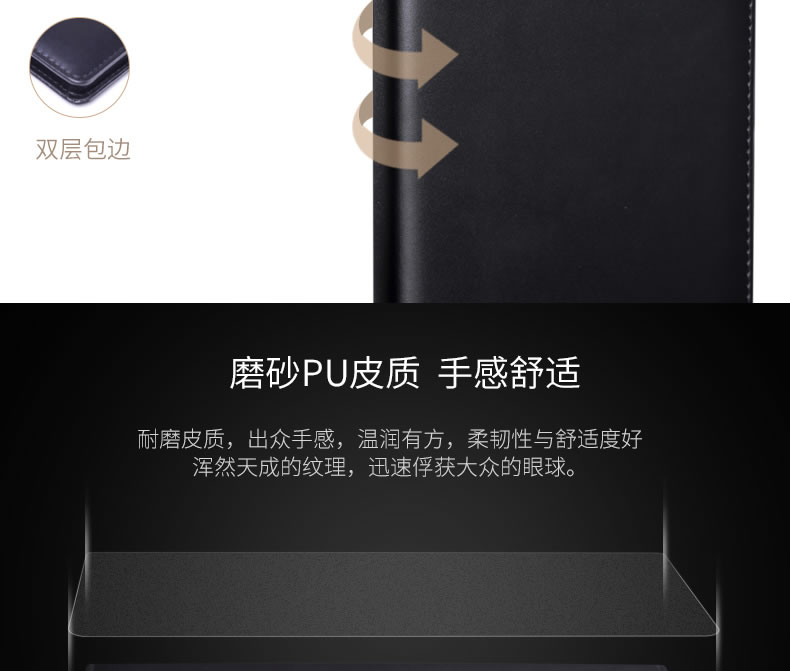 1、黑色PU皮耐磨沉稳,黑色浑然天成的纹理,Pu皮面商务风舒适品质,耐用不失典雅。