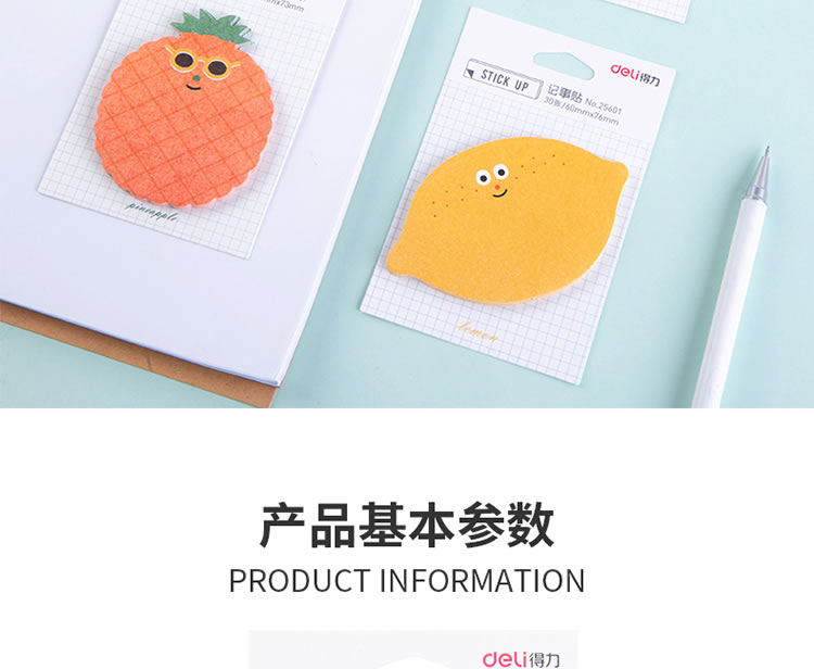 备注:deli得力25601、76*76mm水果主题便签本、创意可爱备忘留言纸、便签本、便条纸、便签纸。