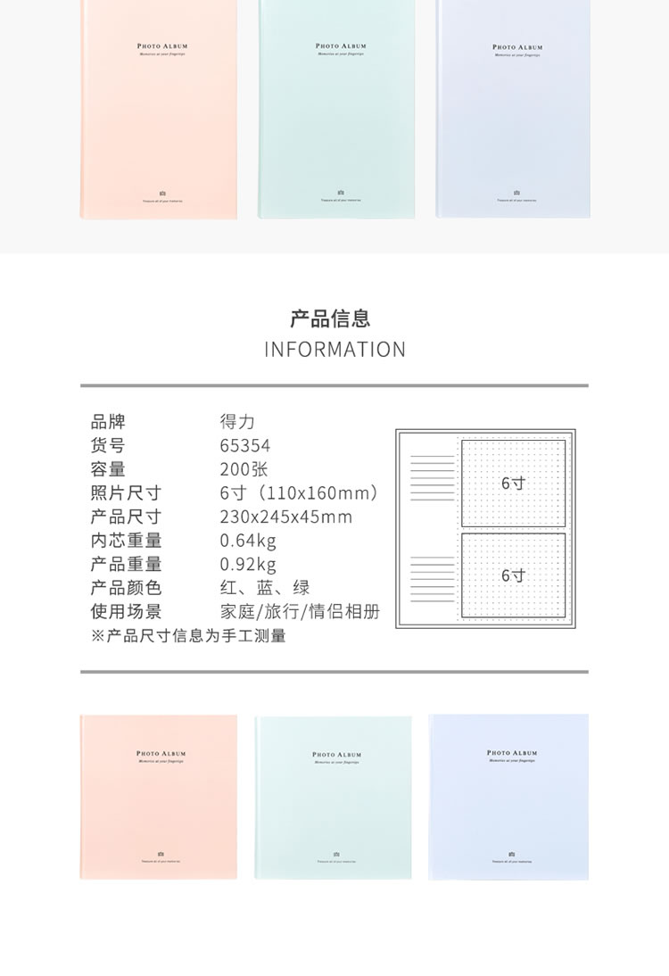 【得力65354相册】deli得力办公文具文具佳和旗舰店出售各种相册,deli得力65354 200张6寸纸芯插页式可标记相册簿 家庭影集宝宝成长记录,相册规格样式颜色齐全欢迎订购。咨询电话:1352-280-4330!