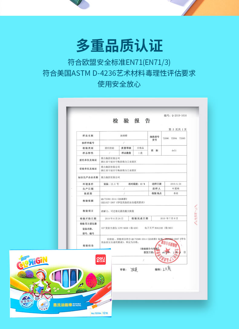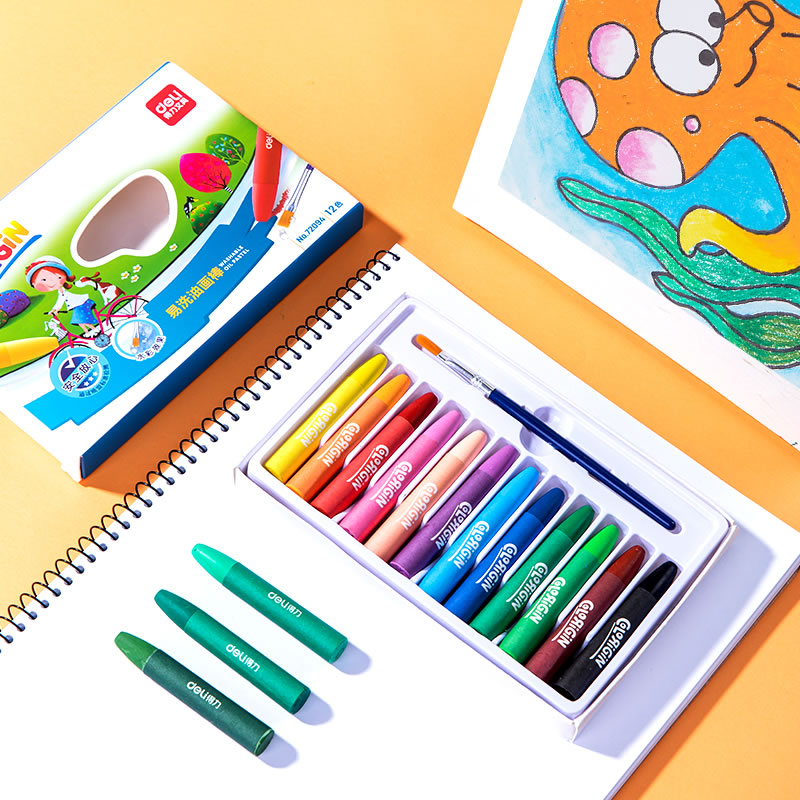 | 产品名称 | 得力(deli)72094 12色易洗学生圆杆水溶性油画棒 儿童蜡笔美术绘画彩绘棒 赠送笔刷1支 | 货号 | ECS003027 |