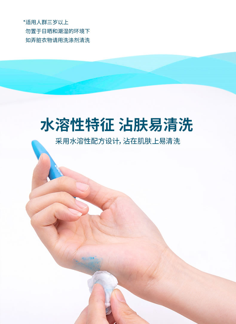 1.水溶性特征沾皮肤易清洗:采用水溶性配方设计,粘在肌肤上,易清洗。