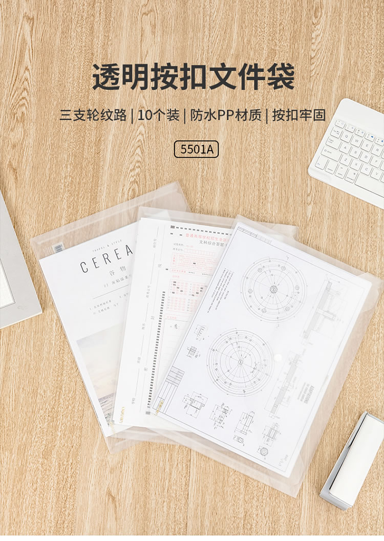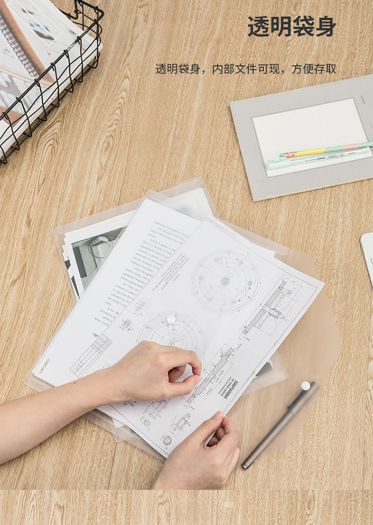 2、办公生活时尚清静,透明文件袋融入您的办公,学习生活,时尚清新。A4规格,规整工作,文件分类,称心如意。