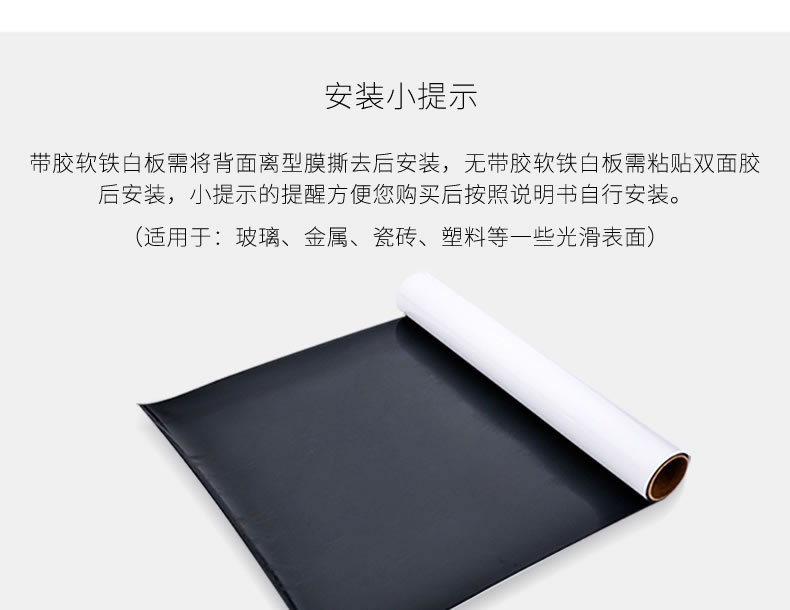 1、背胶软铁白板需将背面离型膜撕去后安装。你购买后按照说明书自行安装。
