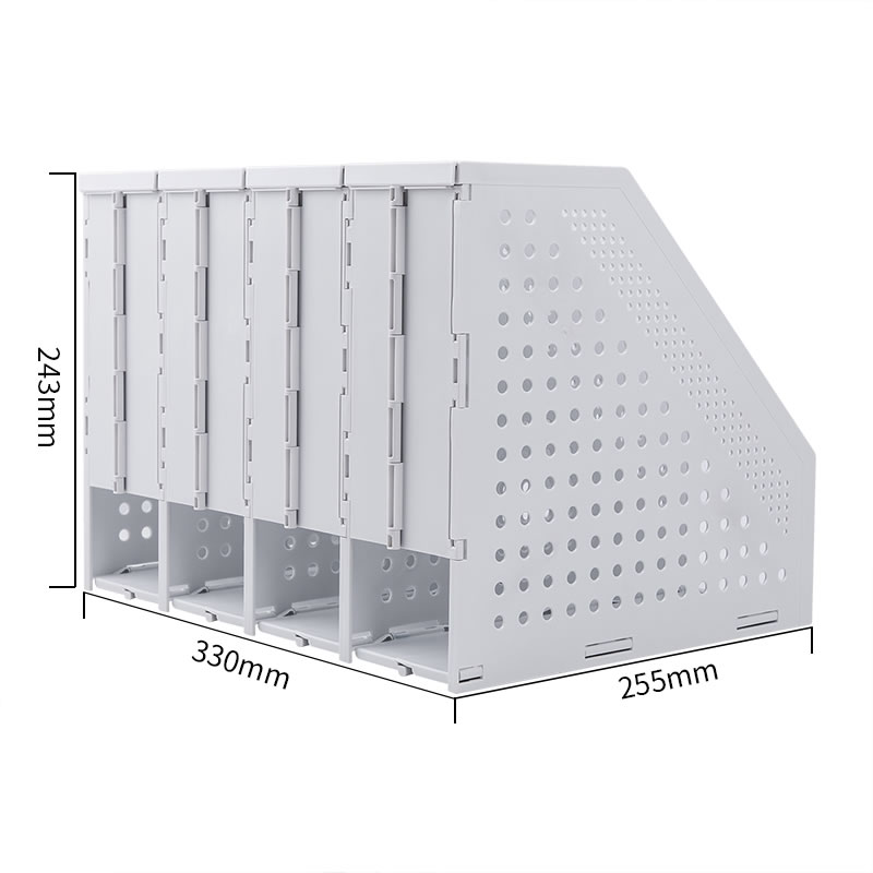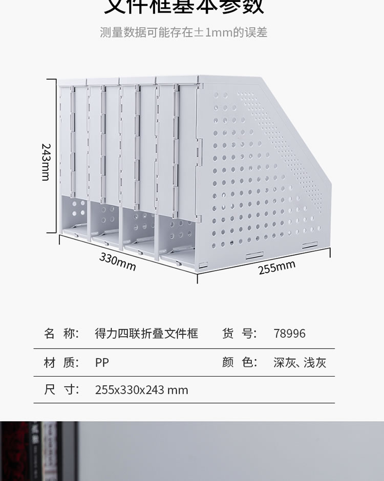 备注:deli得力78996可折叠四联文件框、文件栏、桌面文件筐、资料架、拉伸式便捷安装文件架。