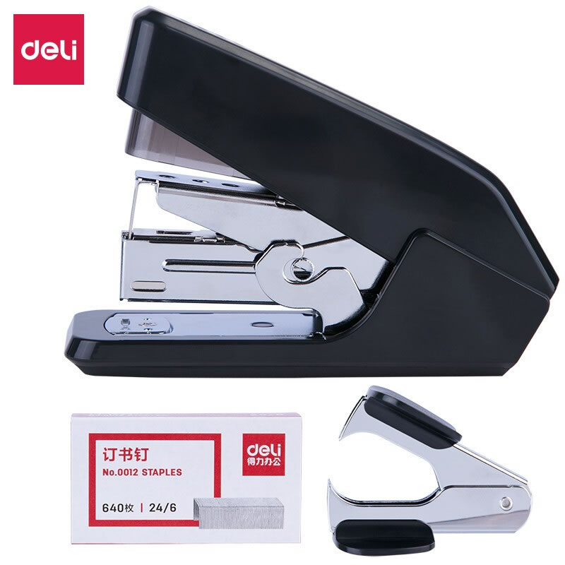 备注:deli得力0458、12#省力型办公订书机3件套装、订书器+订书针+起钉器。