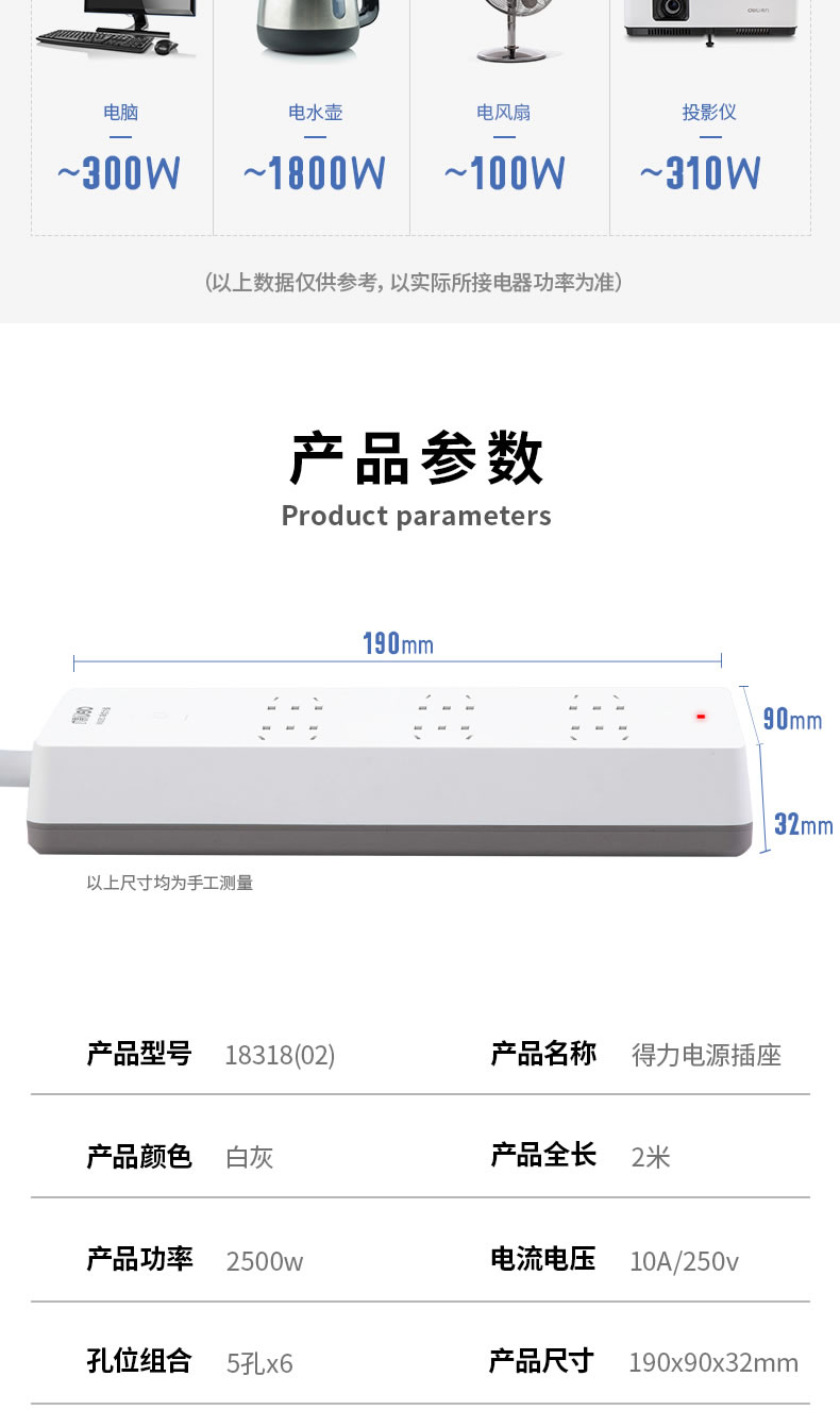 | 产品名称 | deli得力18318(02) 6孔2米新国标总控开关插防滑插座 插排插线板接线板排插拖线板 | 货号 | ECS003233 |