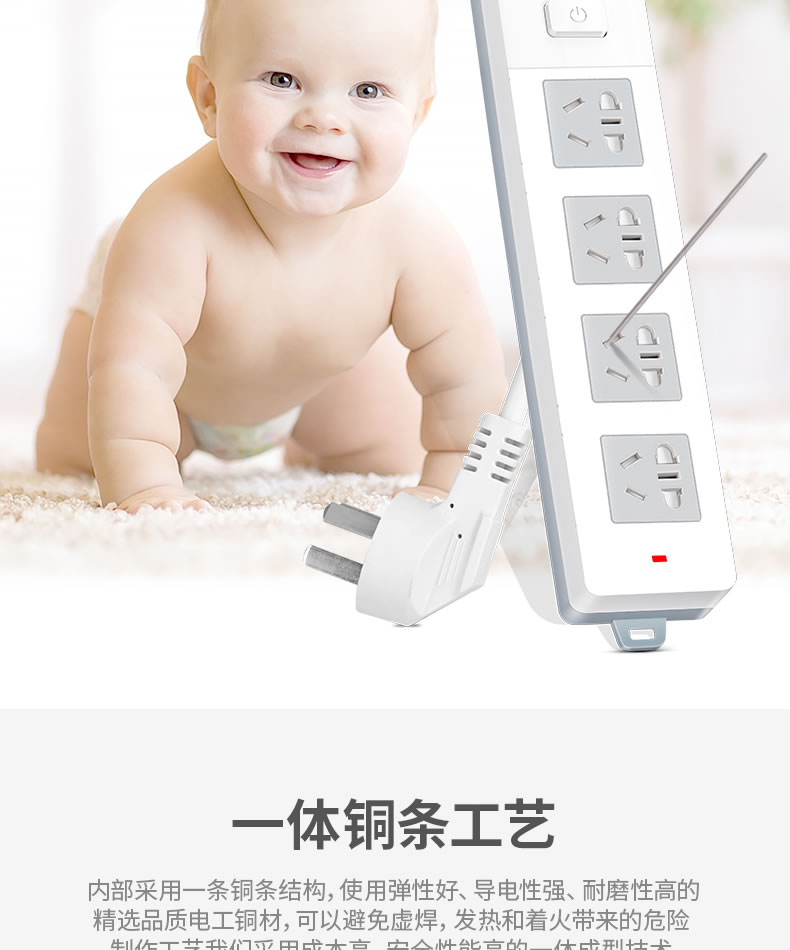 1、内部采用一条铜条结构,使用弹性好,导电性强,耐磨性高的精选品质电工铜材。可以避免虚汗,发热和着火带来的危险。