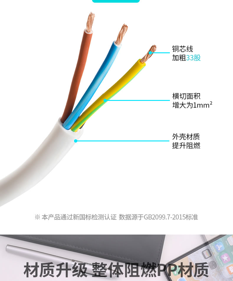 1、内部采用一条铜条结构,使用弹性好,导电性强,耐磨性高的精选品质电工铜材。可以避免虚汗,发热和着火带来的危险。