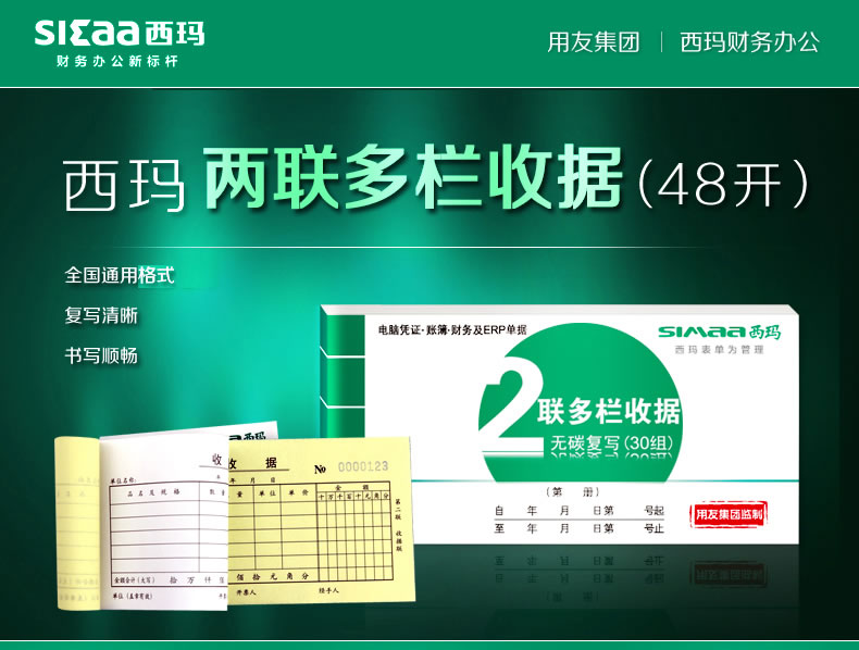 备注:SIMAA西玛SS072302、 175*87mm 48K二联多栏收据 、无碳复写 30组/本*10本。