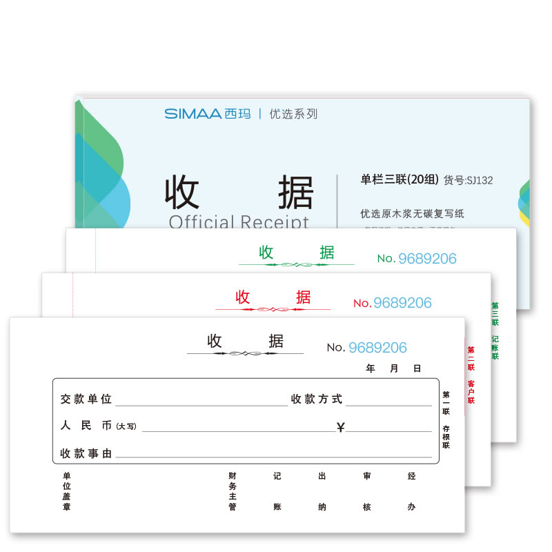 备注:SIMAA西玛优选、 SJ132单栏三联收据无碳复写、54K/17.5*8.3mm 20组/本 10本装。