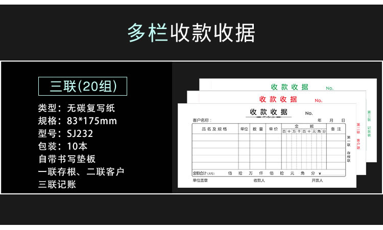 备注:SIMAA西玛优选 SJ232多栏三联收款收据 、无碳复写54K/17.5*8.3mm 20组/本 10本装。