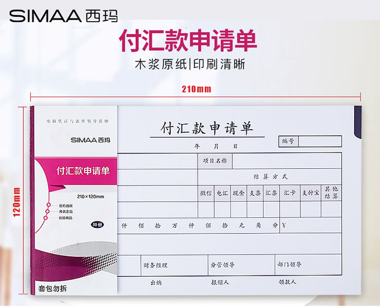 备注:SIMAA西玛SS030805B1 、北京版210*120mm 28K西玛付汇款申请单。