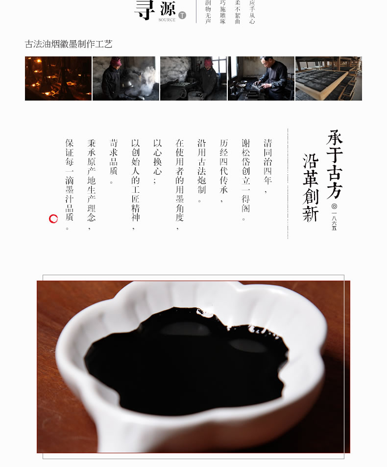 2-取特制浓墨之精华部分,在经过多次轧磨,使得墨质更加稳定均匀,久藏如新,故名为特制浓墨之精品。