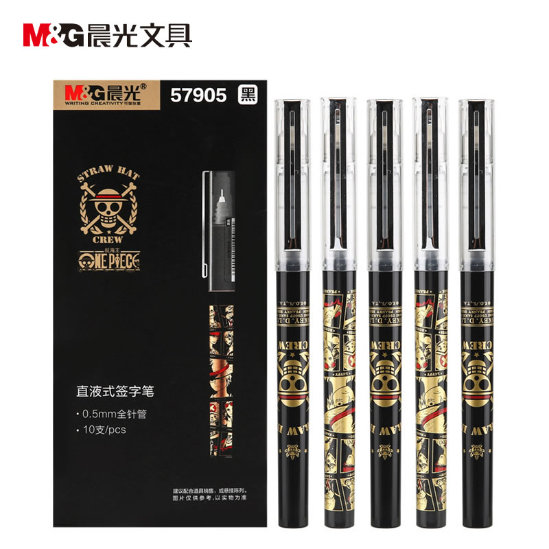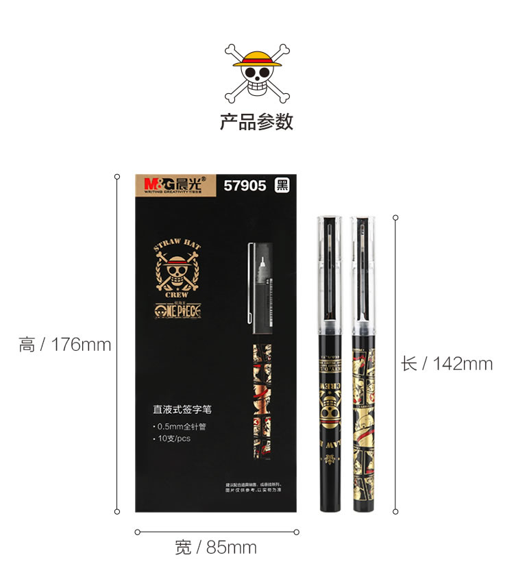 | 产品名称 | 晨光(M&G)QRP57905黑色中性笔 0.5mm航海王系列签字笔 直液式全针管水笔 10支装 | 货号 | ECS005319 |