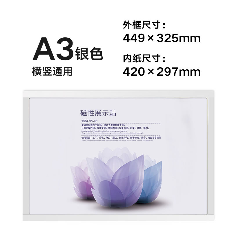 备注:A4/A3磁性展示贴、照片营业执照正本副本保护套展示框、带背胶自粘磁性文件夹速贴框、磁性公告栏通知贴纸、磁力贴磁铁框软磁即时磁片贴。