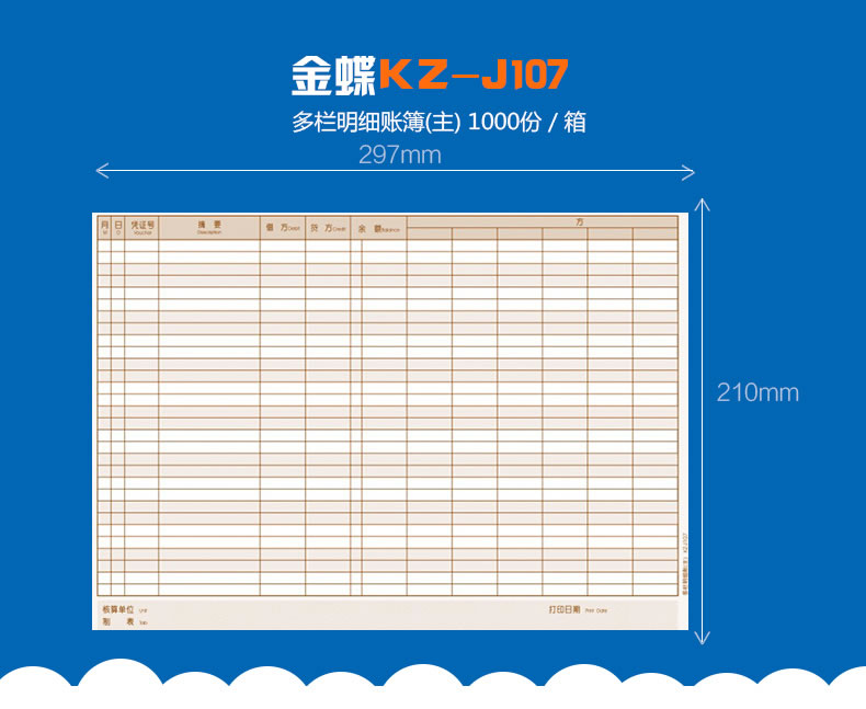 | 产品名称 | 金蝶(kingdee)KZ-J107 A4多栏明细账(主) 210*297mm会计账册帐薄打印纸 1000份/箱 | 货号 | ECS006202 |