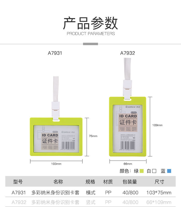 备注:齐心(Comix)A7931横式A7932竖式多彩纳米PP注塑身份识别卡套工作证证件卡胸卡套+挂绳套装、齐心A7931横式A7932竖式多彩纳米PP注塑身份识别卡套、齐心A7931横式A7932竖式工作证证件卡胸卡套+挂绳套装。
