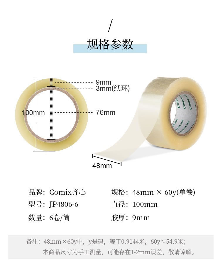 备注:齐心(COMIX)JP4806-6 48mm*60y透明封箱胶带快递打包胶带、齐心JP4806-6 48mm*60y透明封箱胶带、齐心JP4806-6 48mm*60y快递打包胶带。
