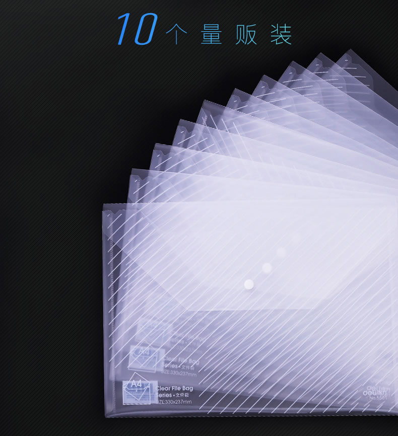 | 产品名称 | deli得力5501 A4按扣文件袋 资料袋票据袋透明档案袋 10个装 | 货号 | ECS000850 |