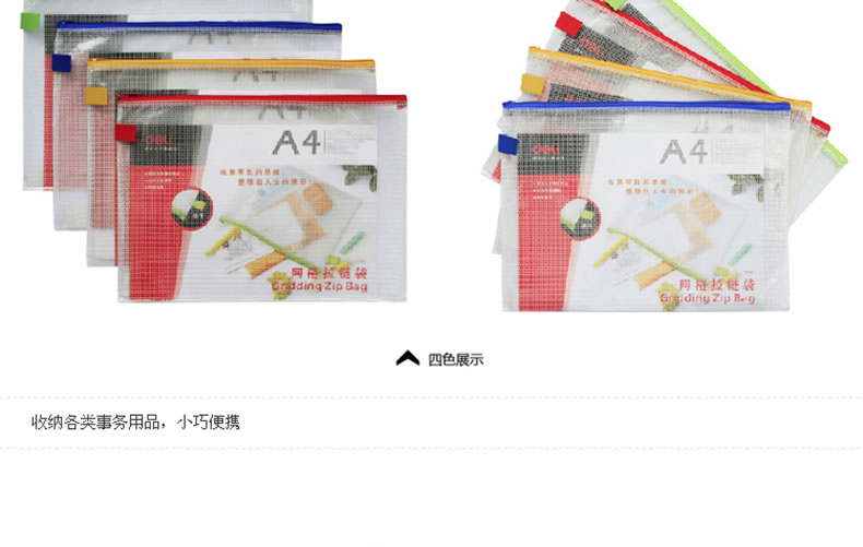 | 产品名称 | deli得力5596 A4透明网纱拉链袋 资料袋文件袋票据袋拉边袋 10个装 | 货号 | ECS000854 |
